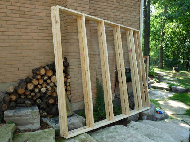 Lo siguiente que hicimos fue juntar todas las paredes.  La 2 x 4 fueron espaciados apartes 2 pies entre sí una vez cortada a la longitud apropiada y entonces permanentemente conectado con el martillo framming.  Luego nos asomamos los cuatro marcos, después de que lado iban, contra la pared de la casa hasta que se terminó la Fundación de la marca.