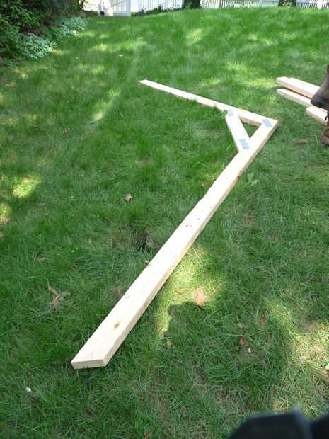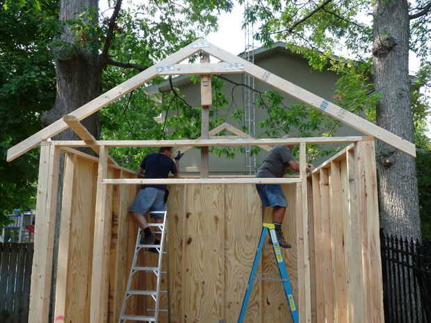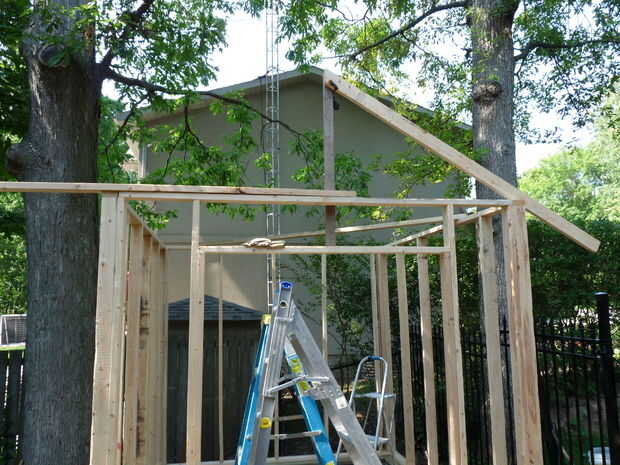 Las cerchas de apoyo la madera y las tejas que cubre impermeable.  Son muy importantes para planificar cuidadosamente porque requieren ángulos extraños y tienen para adaptarse a la estructura por debajo de ellos.  Dimos nuestra vertiente un toldo ligero y esto tuvo que ser acompañado de las cerchas, que sobresalgan de las paredes de la caseta por un pie a cada lado.  Al construir sus vigas es importante utilizar vigas placas de lo contrario los ángulos que usted tan cuidadosamente planeado no seguirá siendo cierto por mucho tiempo.  Se utilizó un 2 x 4 para apoyar las vigas mientras estábamos uniéndolas a las paredes.
