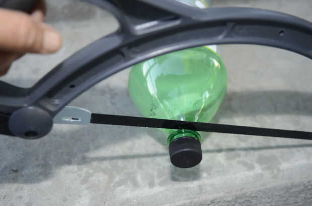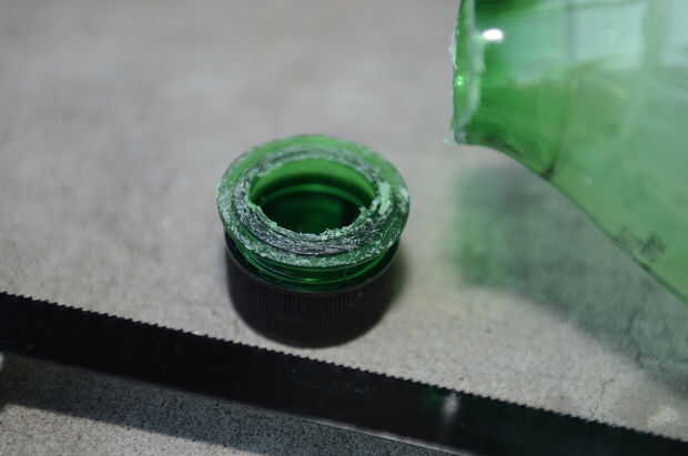 Encontré esa puntuación ligeramente la zona a cortar, wile gira lentamente la botella, para un corte recto agradable todo alrededor.