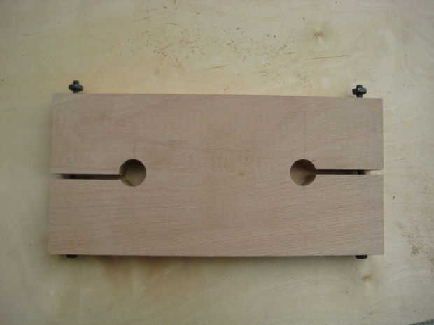 Marca 4 puntos en el borde de la tabla en lugares igual 3/8" del borde y en el centro. En cada uno de estos lugares, perfore un agujero lo suficientemente grande para el eje del perno. Un agujero más grande proporcionará más libertad de acción y será útil para asegurar que los dos agujeros de línea hacia arriba. Una prensa del taladro será muy útil en este paso, pero también funciona un taladro de mano y una mano firme.