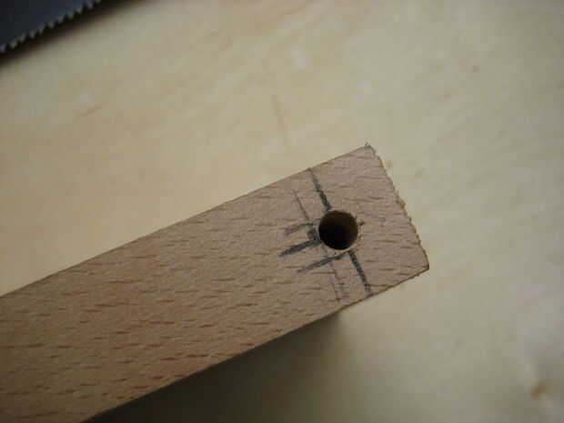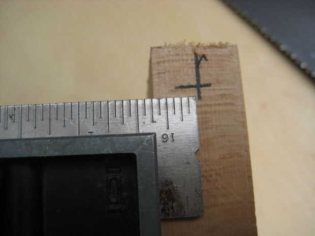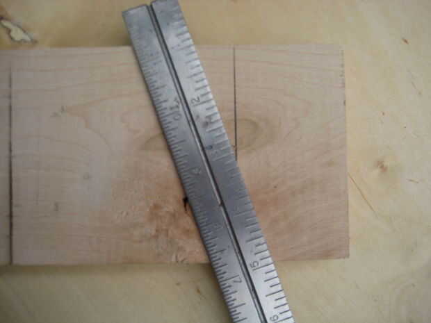 Comience usando la escuadra de combinación para dibujar dos líneas en 2" desde cada lado de la tabla 8. Luego marque el punto medio de cada línea. Utilice estos puntos al centro de los agujeros de 1/2". Una vez que estos agujeros han sido perforado uso que un serrucho para cortar desde el final de la Junta en el agujero.
