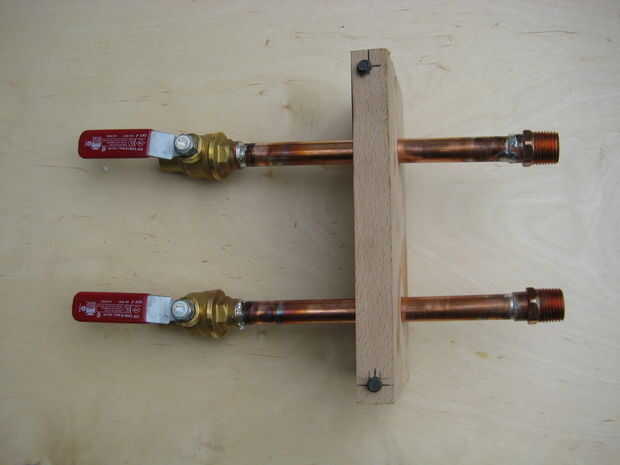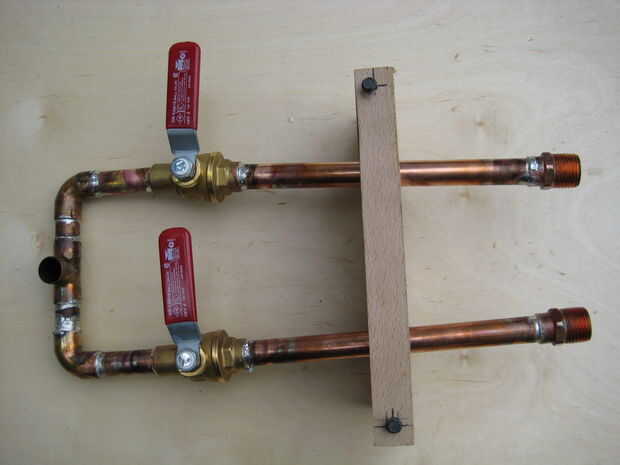 Una vez que las válvulas estén en su lugar conectar ambos a la guarnición de T usando codos. El centro de la conexión T debe mirar hacia delante ya que es donde se conecte la tubería de agua de caries en el fregadero. Utilice un trozo de tubo para que no interfiera con las válvulas.
