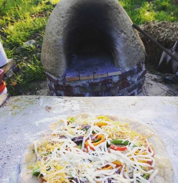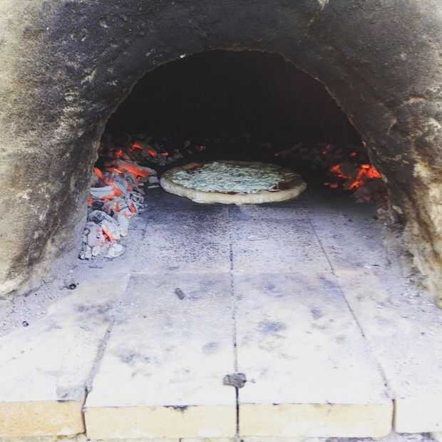 Una vez que había pasado suficiente tiempo y el horno estaba caliente al tacto (en el exterior), nos pueden remover las brasas y tiene que cocinar. Recomiendo usar un termómetro infrarrojo para juzgar la temperatura como que pasamos un poco de ensayo y error (pizza cocinada lentamente al principio así que nos fuimos nuevamente al fuego durante unos 20 minutos y luego pizzas cocinadas en unos 3 minutos cada uno). Se puede ver que barrió a gran parte de las brasas, sino que también se movió a los lados en la última imagen.