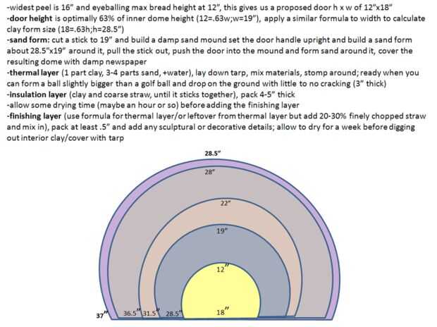 Consistiría en el horno de una campana en forma de espacio vacío (el interior formado usando arena como se verá más adelante), una gruesa capa térmica para retener el calor, un aislamiento más tarde y una capa de acabado, todos de diferente composición y espesor. Ver el cuadro para mi capas previstas y las necesidades de estima refractario para el piso del horno.