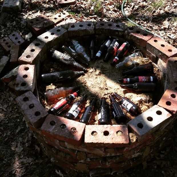Para el aislamiento se utilizó una variedad de botellas de cerveza de raíz y botellas de cerveza desde el lado de la carretera. Nosotros incluso habían organizado todo bastante. Completa entre las botellas con una bolsa de perlita y luego cubrir con arena. Se utilizó una tabla de madera para compactar y nivelar la arena antes de poner los firebricks que forman el piso del horno.