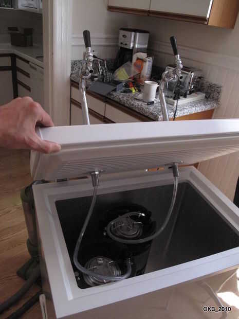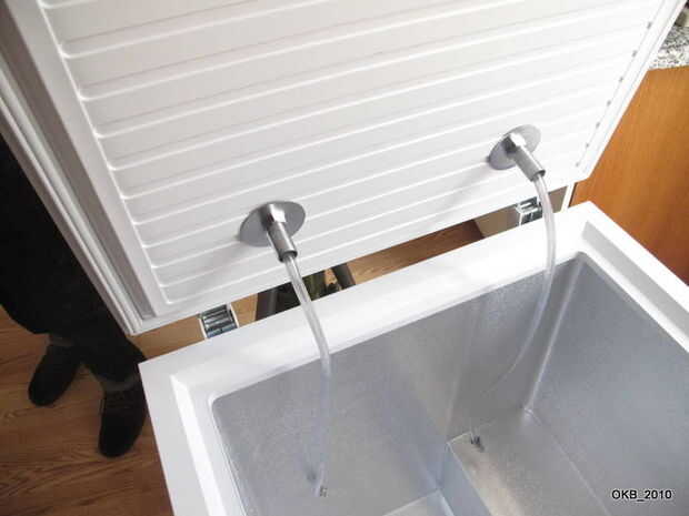 En este punto también puede cortar las líneas de corriente a una longitud que más le convenga. Probablemente no desea demasiada longitud extra, pero no quiere demasiado corto o bien - cortar nuestra en alrededor de 24"- 30" - suficiente para dejarnos con los barriles fuera del congelador, pero permanecer enganchados para arriba (a veces es necesario limpiar las líneas de cerveza y grifos) si se cortan las líneas de longitud, entonces vas a tener que volver a conectar su cierre esférico de gas desconecta , si usted está usando púas o hilo en. Utilice abrazaderas de tornillo sin fin para fijarlos en su lugar. Hecho!