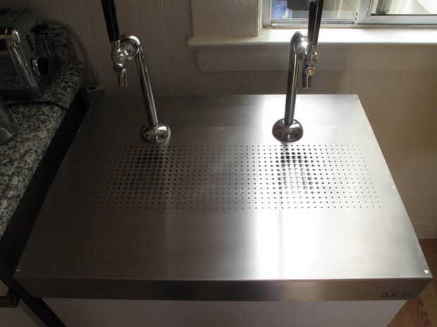 6. furring de la parte superior es bastante sencillo. Quieres listón alrededor de la tapa entera, ambos al frente y detrás de los grifos, y quiere dejar un borde abierto donde la bandeja de goteo se deslice hacia fuera. Corte las piezas longitud y taladro avellanado para que las cabezas de los tornillos están debajo de la superficie y no interfieran en la parte superior de acero inoxidable.