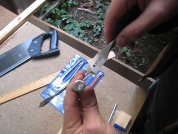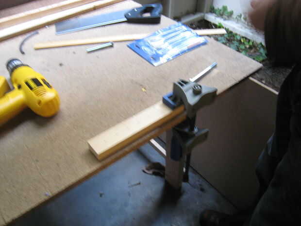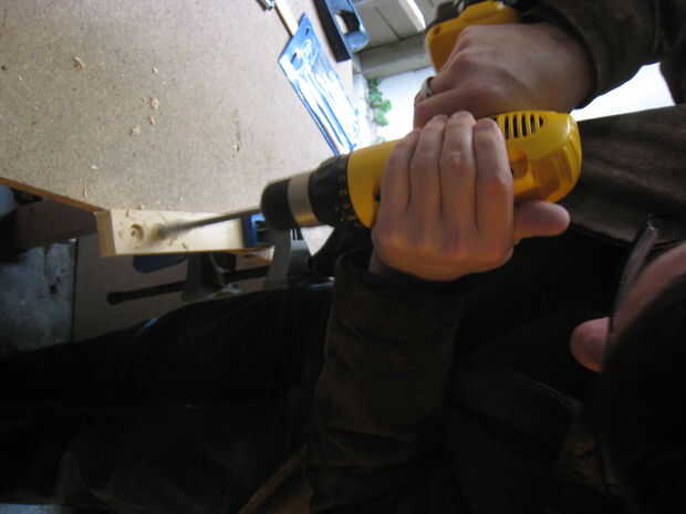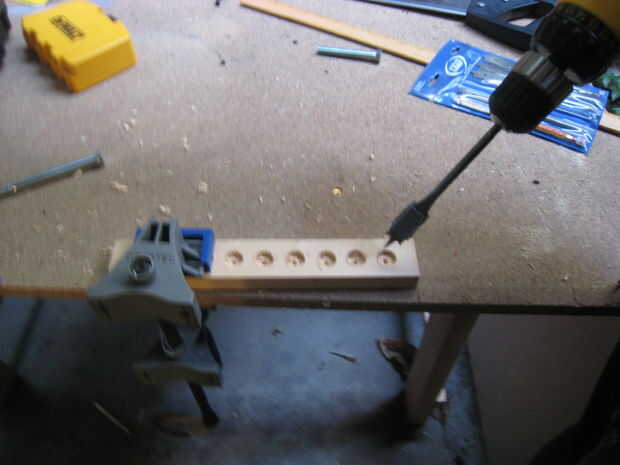 Abrazadera de la base de madera y comience a taladrar a cada uno de los agujeros. Asegúrese de que no perforar muy profundo. Puse un trozo de cinta sobre la broca que estaba usando por lo que pude ver claramente la profundidad iba. Una vez que terminé pasé la base a mi novia a los sostenedores de vela en el lugar.
