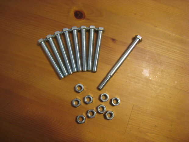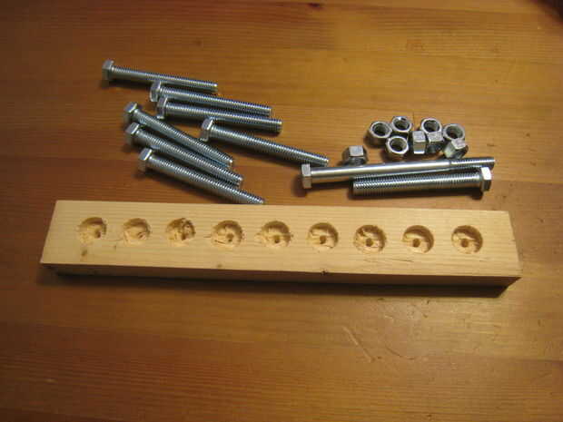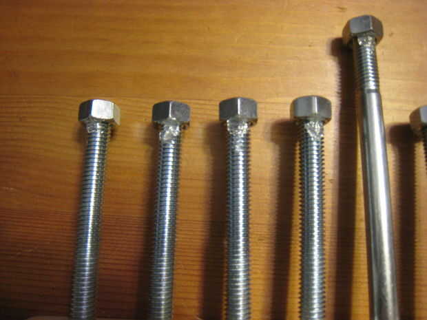 En caso de que no he mencionado, los candelabros son pernos de 9 3/8". Hay ocho tornillos de 3" y un 4" perno que va en el centro. Cada uno luego se tapona con una tuerca 3/8 hexagonal que está enroscada y luego pegar. Pega los 9 pernos en su lugar y luego las tuercas hexagonales.