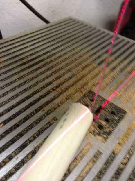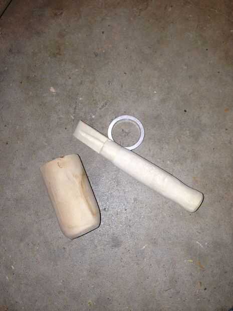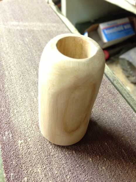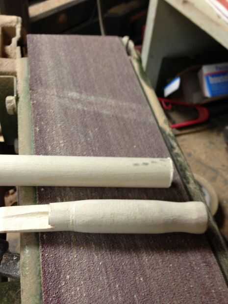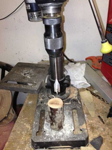 Taladro a través del centro de la clavija con el 1/4" bits y perfore a través de la madera con el orificio de 5/8" sierra. Asegúrese de que estos agujeros son recto y centrado. Corte una muesca de 2" en la espiga como en la imagen. Supongo que alrededor de 12 grados ajuste el pasador para caber en la madera dura de 5/8" perfectamente y con poco espacio. Un torno sería útil aquí! Alrededor de la punta de la espiga como en la imagen y archivo el corte liso. Forma y alrededor de la madera a su gusto y comodidad.