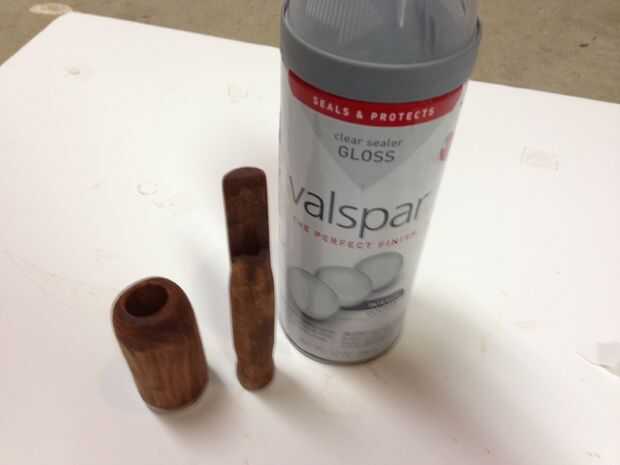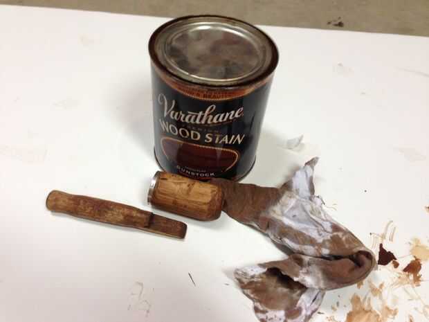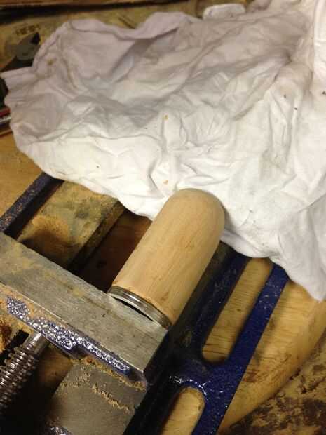 Arena a 220 o así, mancha la capa de madera entonces claro. Puede Agregar una banda de metal o algo que te gusta. Utilicé una parte de un viejo disco duro.