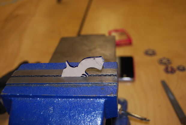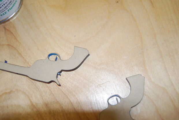 Después de haber cortado su ángulo de la empuñadura del revólver puede que necesite hacer un pequeño trabajo de archivo para perfeccionar la superficie de corte. Desea hacer esto para asegurar un montaje al ras de la parte posterior de su rectángulo. Después de que termine de presentar, pon sus revólveres en la parte posterior de tu rectángulo y algunas anotar marcas de donde quieres que se adjunta. ¡ Prepárate para unir!