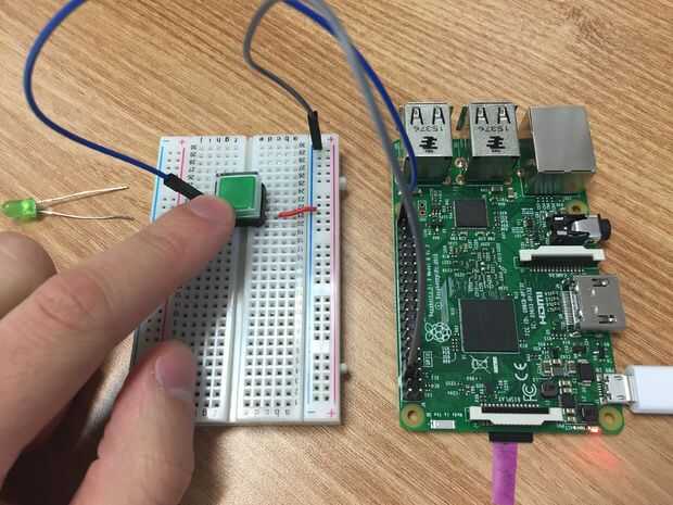 Quizás el ejemplo más simple de una interrupción de GPIO es una interrupción de botón. Para empezar, agregue un botón táctil inyección simple en el protoboard.