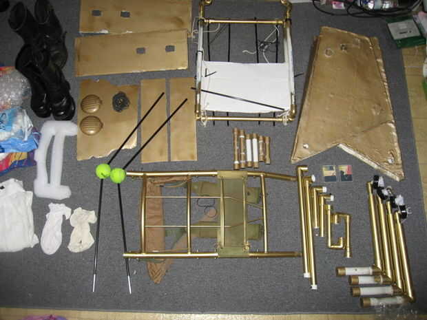 La idea es hacerlo parece que estoy sentado en una silla de montar a caballo encima de un mech de vapor que camina sobre dos piernas robóticas. En realidad son falsas mis piernas sentadas y mis piernas reales de energía las piernas del robot. Esto es básicamente una variante en el traje de payaso de circo antiguo donde alguien parece que está montado en un caballo y también está inspirado en el traje APU de Ben Hallert y el traje de paintball mech llamado Amanecer de acero.