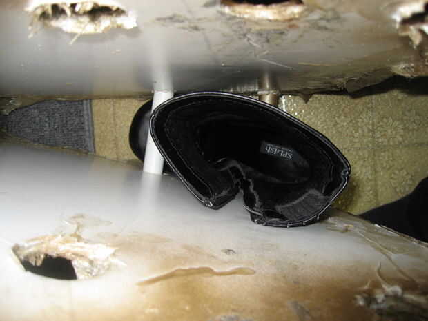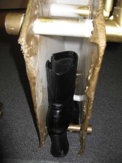 Entonces alguien que me ayude a poner el marco principal sobre mi cabeza, consigo colocar mis brazos por las correas de la mochila ya que se trata. Apriete mi cinturón mientras mi ayudante empuja los clips de la silla de montar en la parte superior de los pistones a través de los orificios en los paneles laterales y encaje en la parte superior de las tuberías laterales en el marco de PVC. Después de mi ayudante pone las patas falsas en el asiento y gomas las botas en su lugar mientras yo pase mi cinturón del pantalón a través de los dos lados de los pantalones de pierna falso y hebilla en el frente. (Asegúrese de estirar a la tela alrededor de su propia cadera tanto como sea posible para que se extienden más allá de donde el panel lateral le protege de la vista). Los rieles laterales del gancho en la parte superior de la estructura de la mochila y en el orificio superior de cada panel lateral y eres bueno para ir!