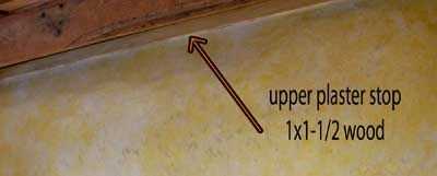 - Antes de que las paredes interiores de yeso es una buena idea instalar una parada de yeso. Para la parte superior de la pared he utilizado una tira de madera que arrancó en la Sierra de mesa. La sujeté con clavos calibre 18. Lo que esto hace, es darle un borde superior consistente en yeso hasta. Cepillada suave y después el accesorio lo engrasado con aceite de linaza. Se ve bien y va con el resto de la madera.