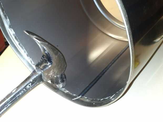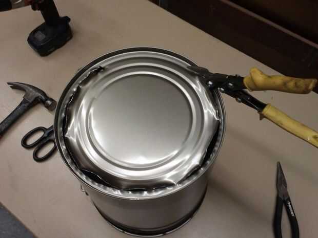 En primer lugar, cortar la parte inferior de la cubeta. Asegúrese de no cortar por los lados del cubo, pero de la parte inferior. Cortar la parte inferior entera de la cubeta debilitará la estructura de acero fino. Perforado un agujero de 1/2" o menos del borde, luego trabajó la lata tijeras de hojalatero alrededor de todo el camino. Entonces, tomó un martillo y aplanado hacia fuera del borde áspero. Esto además refuerza el borde inferior y mantiene las partes agudas, dentadas de cortaduras en las manos o dañar el parche del tambor.