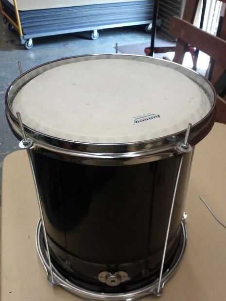 Una vez que tengas la cabeza fija, todo lo que tienes que hacer es apretar las tuercas en la parte inferior. Asegúrese de no apretar demasiado la cabeza! Si haces demasiado apretado, te busto ambas cabezas del tambor. Si usted encuentra que no están recibiendo el sonido crujiente, armónicos de alto que estás buscando, pruebe una cabeza más delgada. Usé un viejo, barato cabeza de Ludwig en la parte inferior y un agradable powerstroke Remo nuevo en la parte superior. Mientras que resultó, el Powerstroke pesaba demasiado y terminé volver a hacerlo para que el Ludwig vino hacia fuera en la parte superior. Y, de hecho, estoy usando la parte inferior de la cubeta como la parte superior del tambor. Es ligeramente más pequeño diámetro (ver foto) hace de un tono ligeramente más alto como la cabeza del tambor es tirado sobre él.