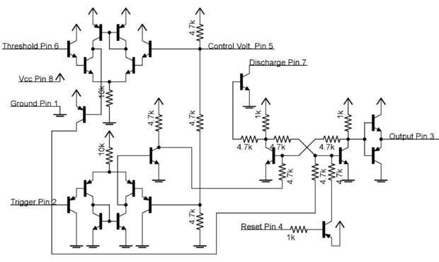 El divisor de tensión es muy sencillo, sólo lleva tres resistencias de ohm de 4,7 K. Tener resistencias de 5 K ohm, utilizar 4,7 K. Puede que desee seleccionar resistencias que tienen valores de cierre para el divisor de tensión para que el Vcc de 1/3 y 2/3 Vcc están tan cerca como sea posible. Por ejemplo, un ohm 4465 (-5% de tolerancia) a 4700 ohmios y un ohmio 4935 (+ 5%) sería una mala selección para el divisor, pero 4600, 4650, 4570 sería una buena selección. Los valores no tienen que ser cerca de 4700, justo cerca uno del otro.