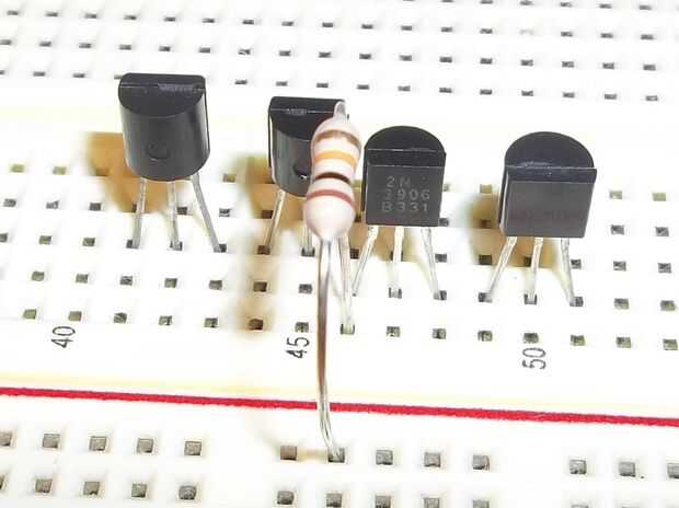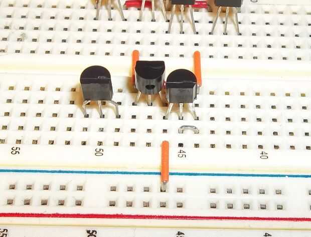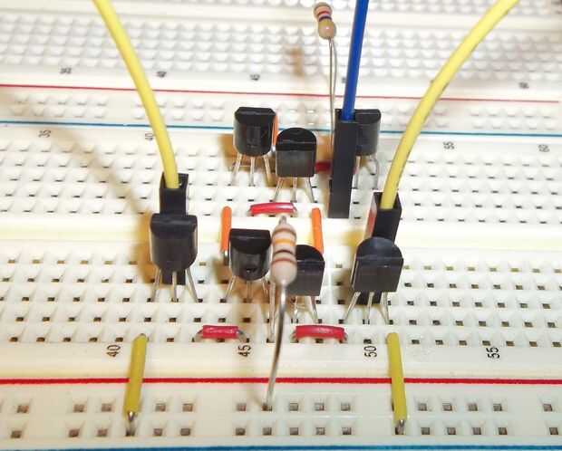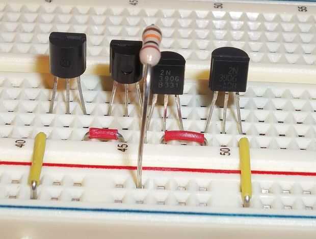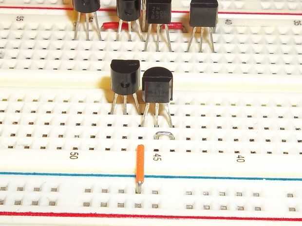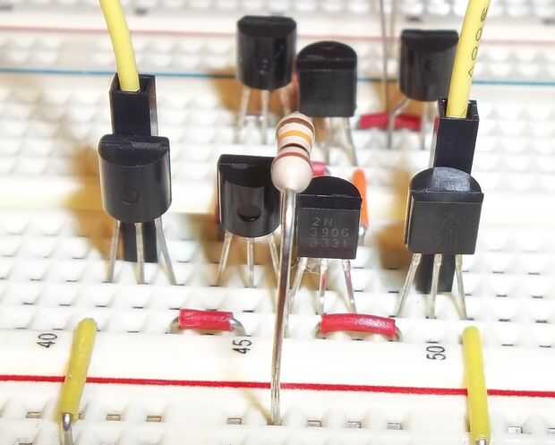 En primer lugar, poner dos transistores PNP en el protoboard para que la izquierda tiene el borde redondeado hacia usted y la derecha tiene el borde plano mirando hacia usted. Tienen sus emisores (la más interna dos conduce) en la misma fila para que estén conectados. También en esta fila, agregue la resistencia de ohmio 10 k y conectar a Vcc.