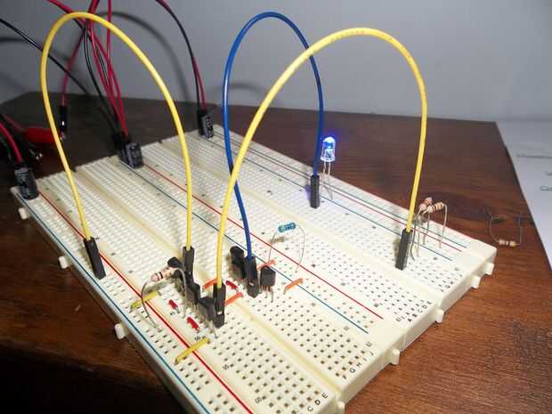 La prueba es simple. El primer paso es añadir poder a la Junta, en cualquier lugar de 3V a 12V debe ser fino, pero tensiones más bajas son más Clemente. Añadir potencia y corte después de un segundo o dos. Sienten los transistores y asegúrese de que ninguno está tibia o caliente. Si lo son, tiene una conexión corta o no en algún lugar. A continuación, hacer un simple divisor de tensión con resistencias de 2 y conecte a la entrada de referencia. Añadir a algún tipo de indicador a la salida, usé un LED. Para que sea luz, tuve que cambiar a la 4 resistencia de ohm 7 k para una resistencia de 470 ohm. Si lo haces, recuerda poner los 4k resistencia de ohm 7 nuevo! Ahora añadir potencia y conectar la entrada a tierra de disparador. El LED deberá encenderse. Cuando se conecta a Vcc, el LED debe apagarse. Si no pasa nada, hay un problema en alguna parte. Si el LED se enciende cuando la entrada es alta, conectado a Vcc y va oscuro cuando la entrada es bajo, cambie las entradas alrededor de.
