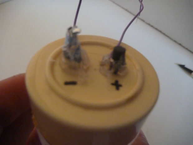 Pegue las dos varillas en su lugar usando la pistola de pegamento caliente. Sellar los dos agujeros para que el agua no puede pasar a través. También pega los dos cables a la parte superior de las barras que se pega hacia fuera