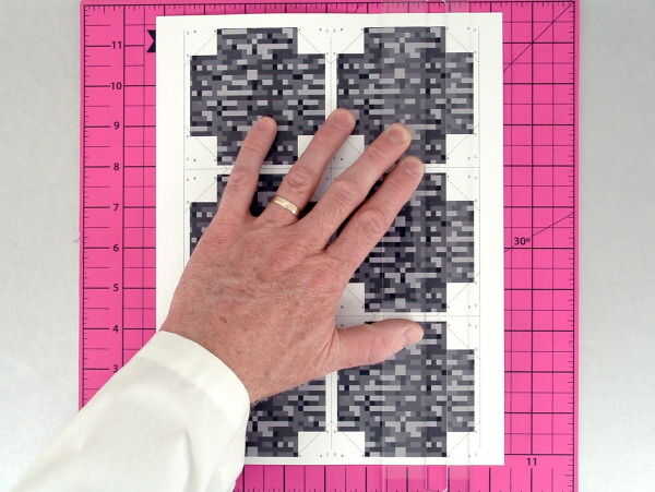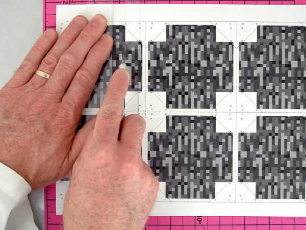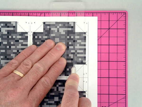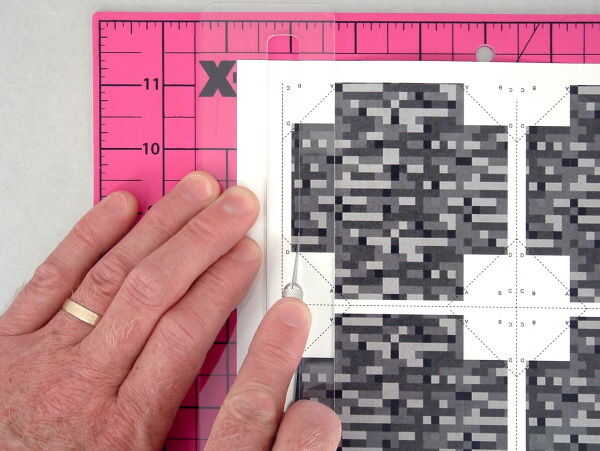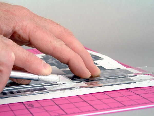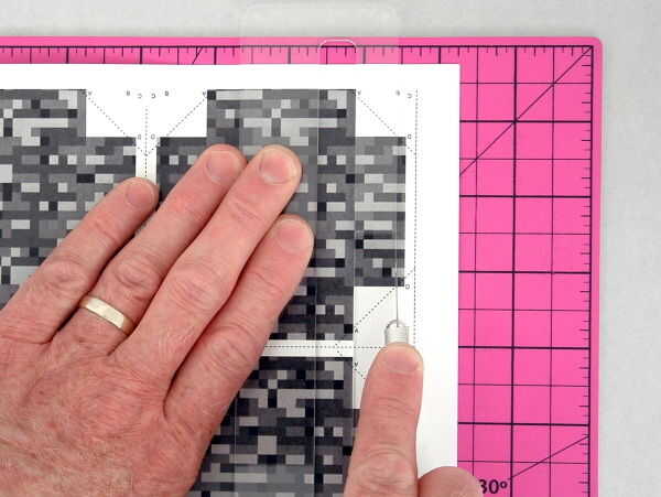 Coloque una página en la almohadilla de corte, cara arriba. Posición dentro de la guía de puntuación a lo largo de un borde de los paneles y espera firmemente en lugar. (FOTO 4 - 1)