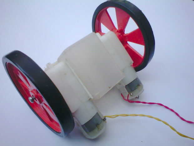 Puedes echar un vistazo a la foto para mas referencia. Colocar las ruedas al motor con la ayuda de la dispuesto tornillos y si echa un vistazo en el pic también se puede ver que yo he soldado pequeños hilos de los motores y el soporte de la batería.