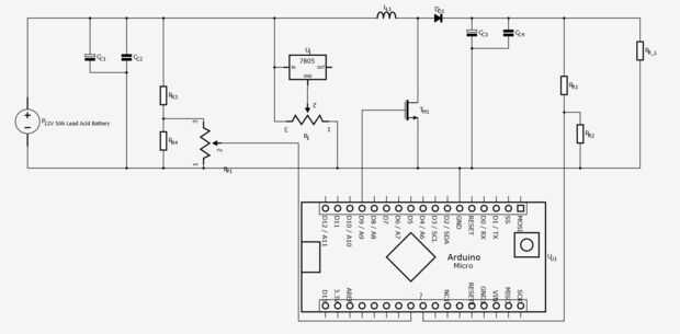 - Retroalimentación de refuerzo: queremos que el Arduino para saber lo que el sistema es la salida, de esa manera puede asegurar la estancia de voltaje a la tensión del usuario elegido. Arduino puede leer tensiones de 0V a 5V. Utilizamos un divisor de tensión para soltar la tensión de salida desde un potencial 20V a 5V. El Arduino ahora puede leer este valor en e interpretarlo.