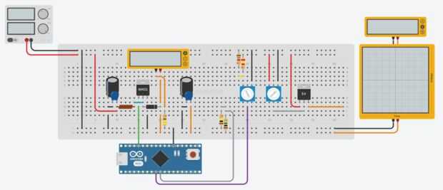 El multímetro de la izquierda muestra cuánto actual dibuja el sistema. Usted notará como aumentar el voltaje, la corriente que requerirá aumentos. El multímetro derecho y el ámbito o mostrar el voltaje de salida y forma de onda de la salida respectivamente.