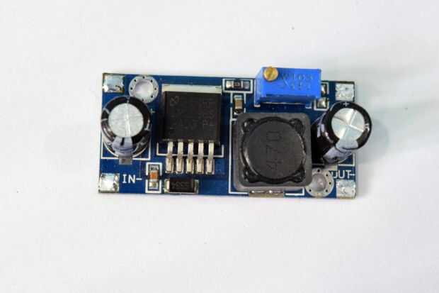 Para este proyecto utilizaremos un Lm2596 Buck Converter, es un regulador de voltaje barato en eBay. También se podría utilizar un regulador de voltaje lineal como L7805 pero tiene eficacia pobre en comparación con la del convertidor buck. El Lm2596 es capaz de convertir voltajes de hasta 30V un proporcionar una corriente máxima de 3A.