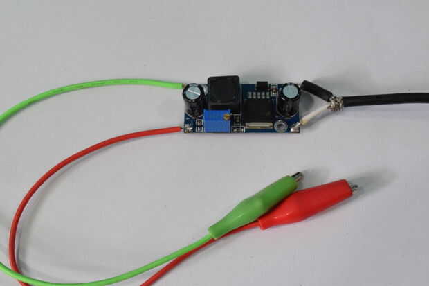 Tenía una pinza cara dos que soldado al terminal de salida del convertidor buck. Puede utilizar cables de colores diferentes como yo lo hice, por lo que no se confunde con la polaridad de los terminales.