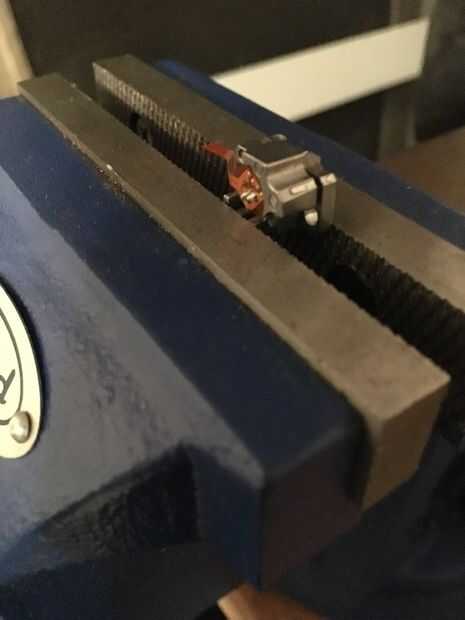 2. recortar la cinta cable off (foto 7) y asegurado a un tornillo de banco (Foto 9) o algo sólido. No quiere aplastar el LD ya que es muy delicado.