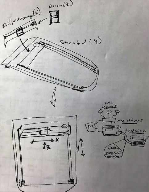 Necesitamos un eje X, Y y Z con los motores, algo para conducir los motores, el 'cerebro' del circuito, la superficie de proyecto, el medio para hacer el trabajo (como un láser o extrusora de impresora 3D, en este caso una simple pluma para empezar), cableado y algo a la cosa. Por último, necesitamos un programa para controlar la máquina en su conjunto y una tonelada de paciencia.