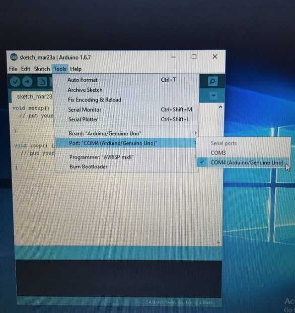 Arduino 1.6.7 (gratis) - revisa tu dispositivo y el número de puerto COM. Simplemente podría hacerlo desde la carpeta de dispositivos en su computadora
