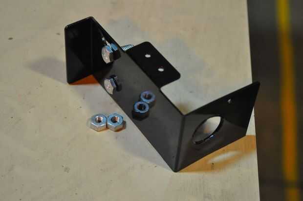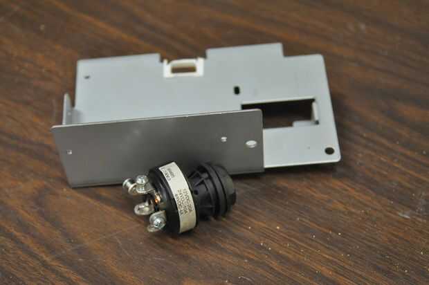 Construí un soporte de montaje por corte una pieza de metal de un caso de reciclado de computadoras. He perforado un agujero para montar el interruptor dominante, dos orificios para tornillos montar el soporte en el marco del ciclo y había pintada de negro. El conmutador recibe dos juegos de cables en la parte posterior, ambas con terminales de pequeño engarzado en anillo. Un sistema va a CC/CC para ejecutar el sistema accesorio de 12V y el otro par activa el contactor principal para el sistema de 48V.