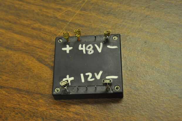 El convertidor DC/DC era un componente de ordenador comprado de e-Bay por $10. Es cuadrado de dos pulgadas por la mitad una pulgada gruesa, muy compactada y ligero. Esto ahorra peso y bulto considerable sobre una batería de tamaño mediano y un cargador dedicado. 48V de las baterías de coche es cablear hasta el extremo de la entrada del convertidor. El extremo de salida del convertidor toma el lugar de una batería de 12V. El + va al panel de fusibles de ciclo y el - va a la tierra de marco de motocicleta.