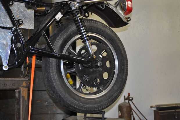 No utilizo el stock piñón en la rueda trasera de la motocicleta. Motores eléctricos tienden a trabajar mejor girar más rápido que los motores de gasolina y engranado hacia abajo un poco más. Esto le da un montón de energía, sin corriente constante alta corriente a través del motor.