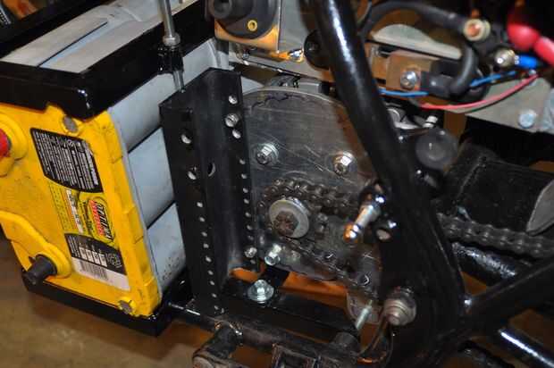 La motocicleta utiliza un piñón estándar de la máquina. Simplemente fui a una tienda de la granja, que tenía un tractor decente reparación pasillo y encuentra las piezas para el piñón y la cadena. Compré un piñón de 14 dientes y un cubo con un agujero de centro de 7/8" para que coincida con el eje del motor. Estas son dos partes, compradas por separado, que permite mayor flexibilidad en eje diámetro y piñón diente cuenta. El piñón y el eje tuvieron que ser soldadas con autógena juntas. En la primera versión de mi ciclo, que era la única soldadura en todo el proyecto. Era solamente más adelante, cuando tuve alguna soldadura que había abordado el rack de batería soldada con autógena de la experiencia. En el piñón original, tuve alguien soldar los dos trozos juntos para mí. Eran baratos - debajo de $20 para ambas partes. Si quiero cambiar el engranaje en el ciclo, todo lo que necesito hacer es gastar otros $20 en la tienda de la granja y conseguir un piñón con un número diferente de dientes. Estas mismas piezas también pueden ser ordenado por correo de un distribuidor como Grainger u otro proveedor industrial.
