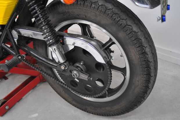 El motor tiene un piñón, que se conecta a una cadena, que da vuelta a la rueda trasera. Eso es todo!