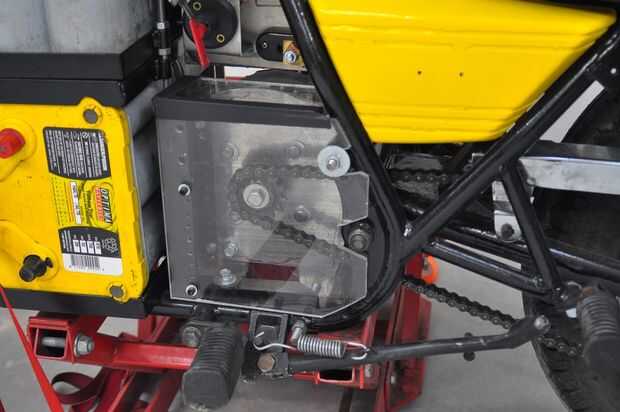 En la parte delantera, la transmisión normalmente tendría una cobertura integral sobre el piñón de cadena y disco. Sin la tranny, significaba que tenía que hacer una cubierta de encargo de la cadena. Se podría haber hecho de casi todo - metal, plástico, madera, pero quería mostrar cómo funciona el ciclo, así que fui con plexiglás. Bordillo de madera la forma necesaria con un cartón y un lápiz y luego corte el plexiglás para caber el espacio. Una pieza de plexiglás recta cubre la parte superior de la cadena. Usé un trozo de un carril de aluminio como un espaciador entre la placa de montaje del motor y el plexiglás para mantener en posición.