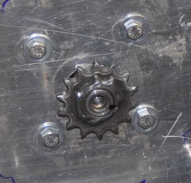 El piñón se desliza sobre el extremo del eje motor y es sostenido en lugar por un chavetero, llave cuadrada y tornillos de fijación.