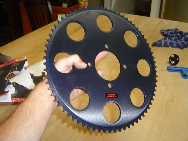 Tengo un piñón de aluminio para una Kawasaki KZ440 cadena #40 y 72 dientes. Tiene un acabado negro de protección. El más grande aluminio piñón pesa menos que el acero común uno hizo. (Ahorro de peso es siempre una buena cosa para los vehículos eléctricos). Quitar la rueda trasera, desatrancó la rueda de bolsa y había sustituido por el encargo. Consulte el manual de servicio del ciclo para asegurarse de que los tornillos están apretados correctamente, y que la rueda trasera es reinstalada derecha.