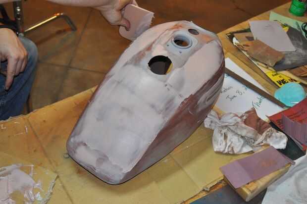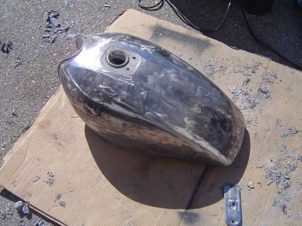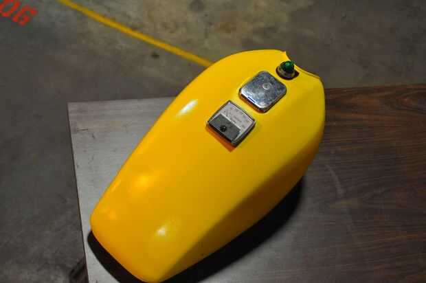 Cuando llegué a la motocicleta, el tanque era ya oxidado y abollado. Estaba totalmente seco de hueso, pero todavía lo dejé abierto durante unos días antes de cortar la parte inferior con una amoladora de ángulo, por lo que yo podía vencer a las abolladuras desde el interior. Luego desnudaron la pintura existente y le dio un nuevo trabajo de pintura. La parte superior del bastidor de la motocicleta es un tubo que va directamente a través del tanque de gas. El tanque es casi como una bolsa de sillín que se cierne sobre esa barra. El tanque también se curva y las baterías son casi siempre grande rectangular. Así, entre el marco y la forma del tanque, solo no vas a meter pilas allí (que también aumentaría el centro de gravedad en el ciclo así.) El tanque hace una cubierta excelente sobre las pilas. También sería un buen lugar para montar el regulador del motor o un cargador de baterías, mientras que asegurarse de que tienen suficiente ventilación.
