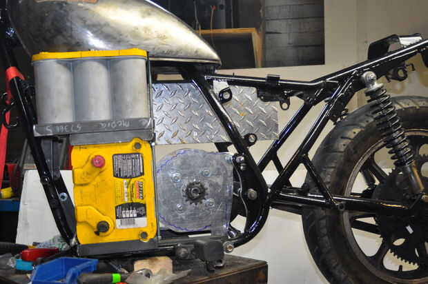 La placa también necesita puntos para conectar en el marco de la motocicleta de anclaje. En este proyecto, volver a usé el existir puntos en el marco del ciclo de montaje donde el motor y transmisión originalmente atornilladas en su lugar. Esos agujeros son ya casi donde les necesitaba y que significaba que no tenía que hacer nuevos agujeros en el marco.