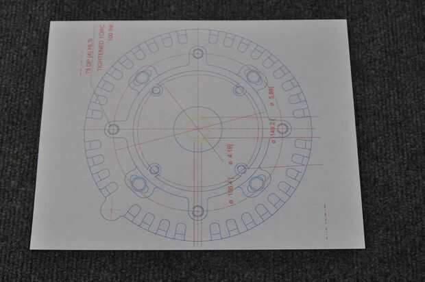Corte el pedazo de papel y luego pegué (cemento de caucho) a la placa de aluminio. Usando un taladro, yo simplemente los orificios perforados del tamaño adecuado (el tamaño es marcado en el diagrama!) a través de la mira en el papel. Eso me dio un plato de aluminio con un agujero central para el eje motor y cuatro agujeros para montar el motor a la placa. Prueba de ajuste la placa en su lugar en la motocicleta, con el orificio del eje alineando con las marcas en el cuadro que indica que la cadena fue originalmente. Bosquejó luego derecho en las placa "lengüetas" de donde la placa se extendería a los puntos de montaje existentes en el bastidor - uno en la parte inferior y otro en la parte alta de la espalda. Más adelante agrego otro punto de enganche en la parte delantera con una escuadra.