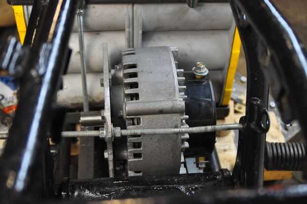 Una vez redondeado de los bordes, poner la placa en la moto y corrió varillas roscadas (3/8" y 5/16", que empareja los agujeros en el marco) a través de los puntos de anclaje de marco, a través de la placa y el correspondiente punto de anclaje. Las arandelas y las tuercas nylock acero inoxidable fueron en ambos lados de la placa del adaptador y en el exterior de la estructura de la motocicleta. Si alguna vez necesito ajustar la posición del motor de lado a lado, puedo aflojar las tuercas de ambos lados de la placa y mover una dirección u otra.