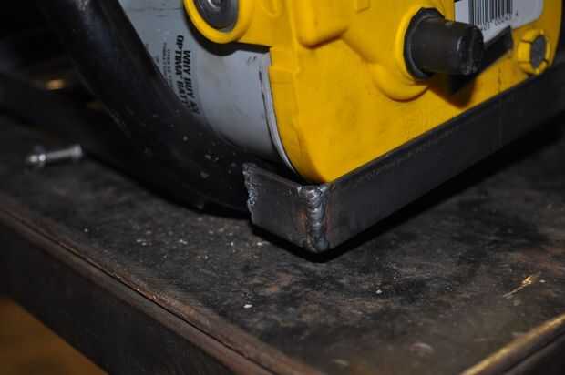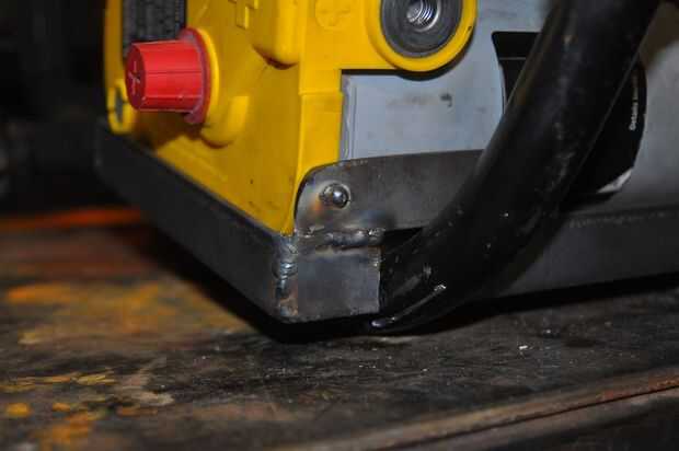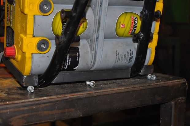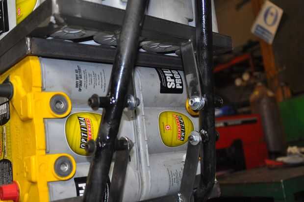 Las lengüetas de montaje de los componentes del rack de batería al marco eran sólo planos de acero - 1" de ancho. Ponga las pilas y estante de partes en el marco y ajustar el espaciado entre el bastidor y el marco y sujeta en su lugar. Luego he quitado todo y soldado con autógena las pestañas.