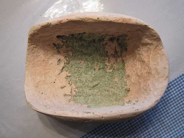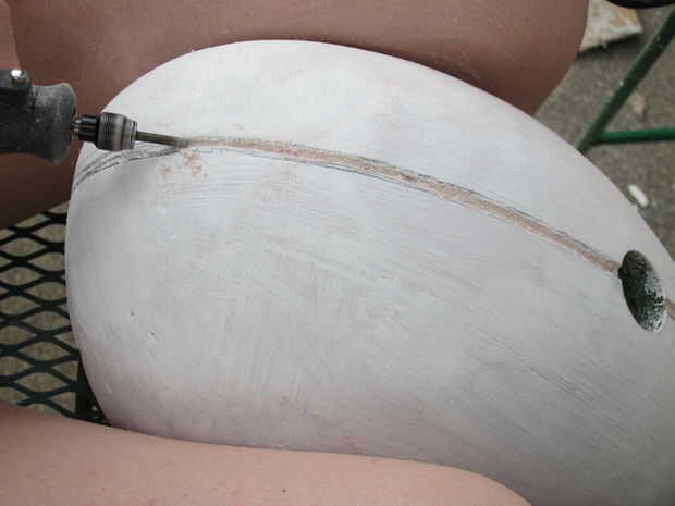La ranura a lo largo de la parte posterior fue tallada por broca de punta fina de la dremel. Nos sacó donde queríamos la línea con cinta, trazada a lo largo de las líneas con lápiz y luego dremeled a lo largo de dicha línea. Nuestra línea es aproximadamente de ¼" de ancho. Como tienes una mano firme, esto debería ser bastante sencillo... a pesar de permanecer dentro de las líneas con un instrumento destructivo que está girando a alta velocidad es, sin duda, algo estresante!