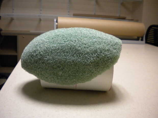 Cuando las compras de materiales de la cáscara, por alguna razón, el mayor bloque de espuma que pudimos encontrar fue una hoja de aproximadamente 3ftx4inx1ft, pero una vez que corte por la mitad y pega las piezas con una combinación de pegamento de madera de embarcaciones y Goop de Plumber (un derivado de Goop increíble específicamente diseñado para tuberías de PVC) terminó con un considerable trozo perfectamente lo suficientemente grande.